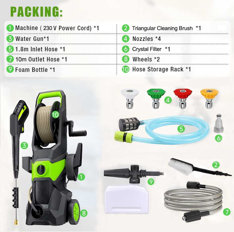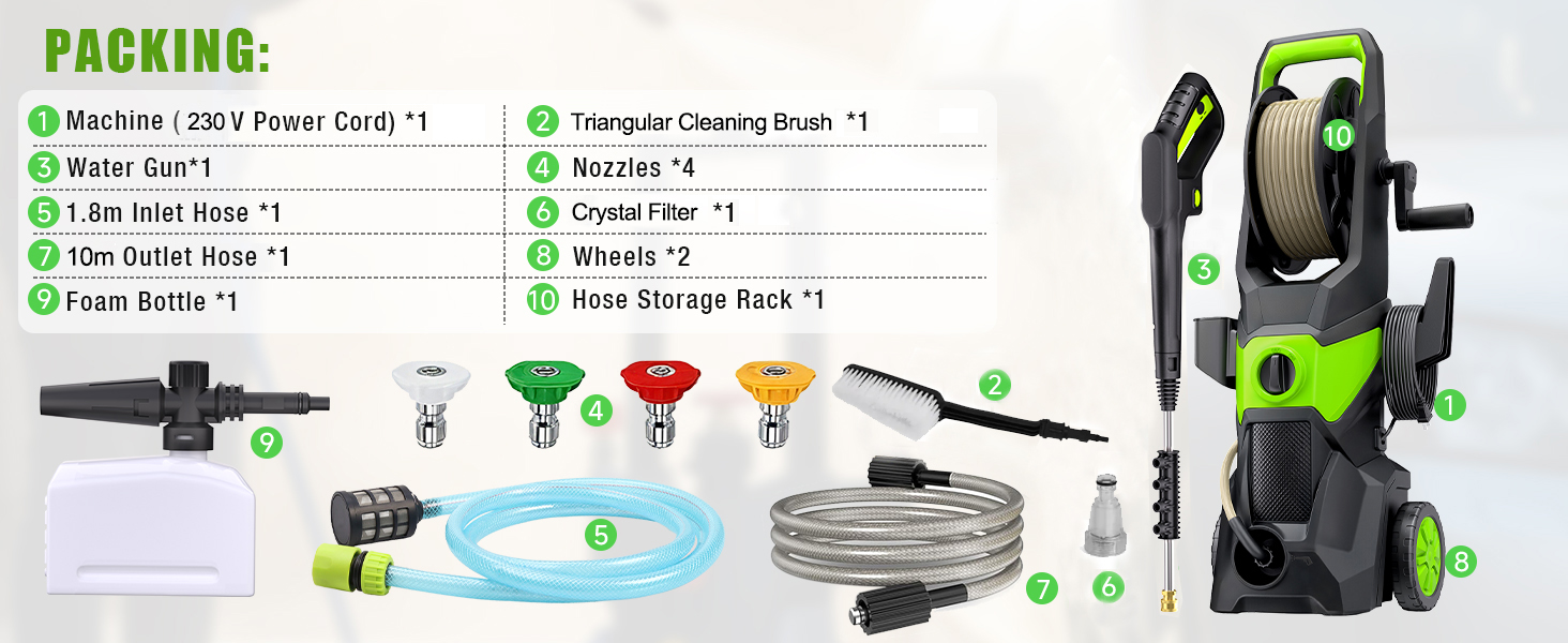 Equipped with a foam cannon, the pressure washer produces thick, clinging foam that softens stubborn dirt and grease for more effective cleaning. The foam also acts as a protective layer, reducing friction and preventing scratches on sensitive surfaces like car paint. Easy to use and adjustable, it's ideal for car washing, patio cleaning, mold removal, and more — perfect for both home and professional use.